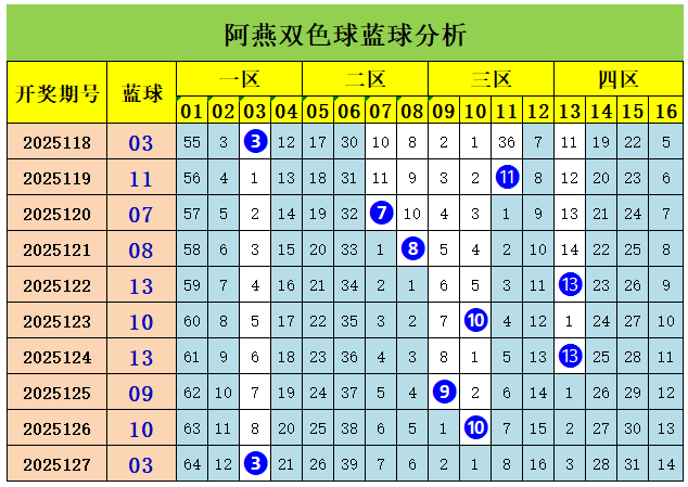 三差异析(三区画分:一区01-11段11码,二区12--22段11码,三区23--33段11码) 一区:上期开出2个奖号03、09,在前10期开奖中,该区共开出21个奖号,一区落号较热,本期预测该区落2个奖号,参考号码02、08 二区:上期开出3个奖号15、17、19,在前10期开奖中,该区共开出18个奖号,二区落号较冷,本期预测该区落3个奖号,参考号码13、20、21 三区:上期开出1个奖号28,在前10期开奖中,该区共开出21奖号,三区落号较热,本期预测该区落1个奖号,参考号码32 奇偶分析:上期开出5个奇数号码03、09、15、17、19、,1个偶数号码28,最近10期奖号奇偶比为31:29,最近30期奖号奇偶比:93:87,本期看酷爱数号较上期升温,参考奇偶比2:4 大小分析:上期开出3个大奖号红球17、19、28,3个小奖号红球03、09、15,最近10期奖号大小比为30:30,最近30期奖号大小比为90:90,本期瞻望大奖号走势保捏 ,参考大小比3:3 二、蓝球分析: