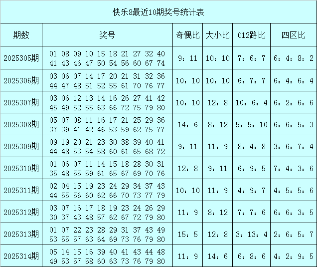 福彩骄气8第2025314期开出奖号:05 14 15 16 39 40 41 43 44 48 49 53 57 58 60 63 73 76 79 80,其中奖号奇偶比为11:9,大小比为14:6,012路比为6:8:6,四区比为4:2:9:5。