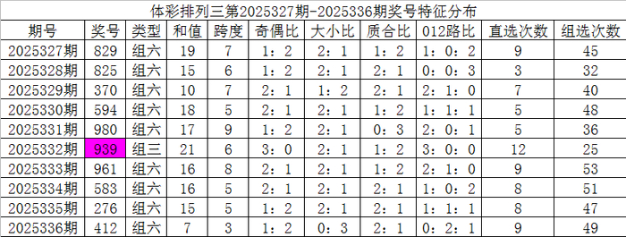 开奖公告:体彩陈设三第2025336期开出奖号:412。组六,有重号:2,奇偶比1:2,大小比0:3,012比0:2:1,和值7,跨度3。