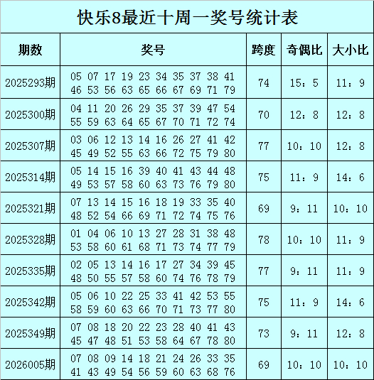 福彩舒心8第2026005期(上周一)开奖追想:07 08 09 14 18 21 24 26 33 35 41 43 49 54 56 59 60 63 68 76,其中奖号奇偶比为10:10,大小比为10:10,012路比为8:4:8,首尾间距为69。
