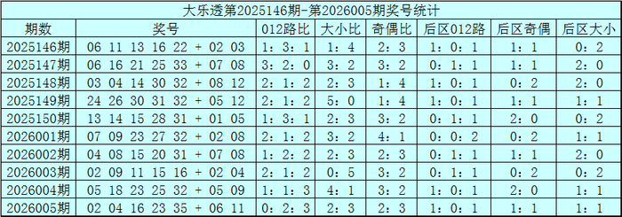 体彩大乐透第26005期奖号为:02 04 16 23 35+06 11,前区奖号012路比为0:2:3冠鸿生科技有限公司,奇偶比为2:3,大小比为2:3,后区1路号码轮空。